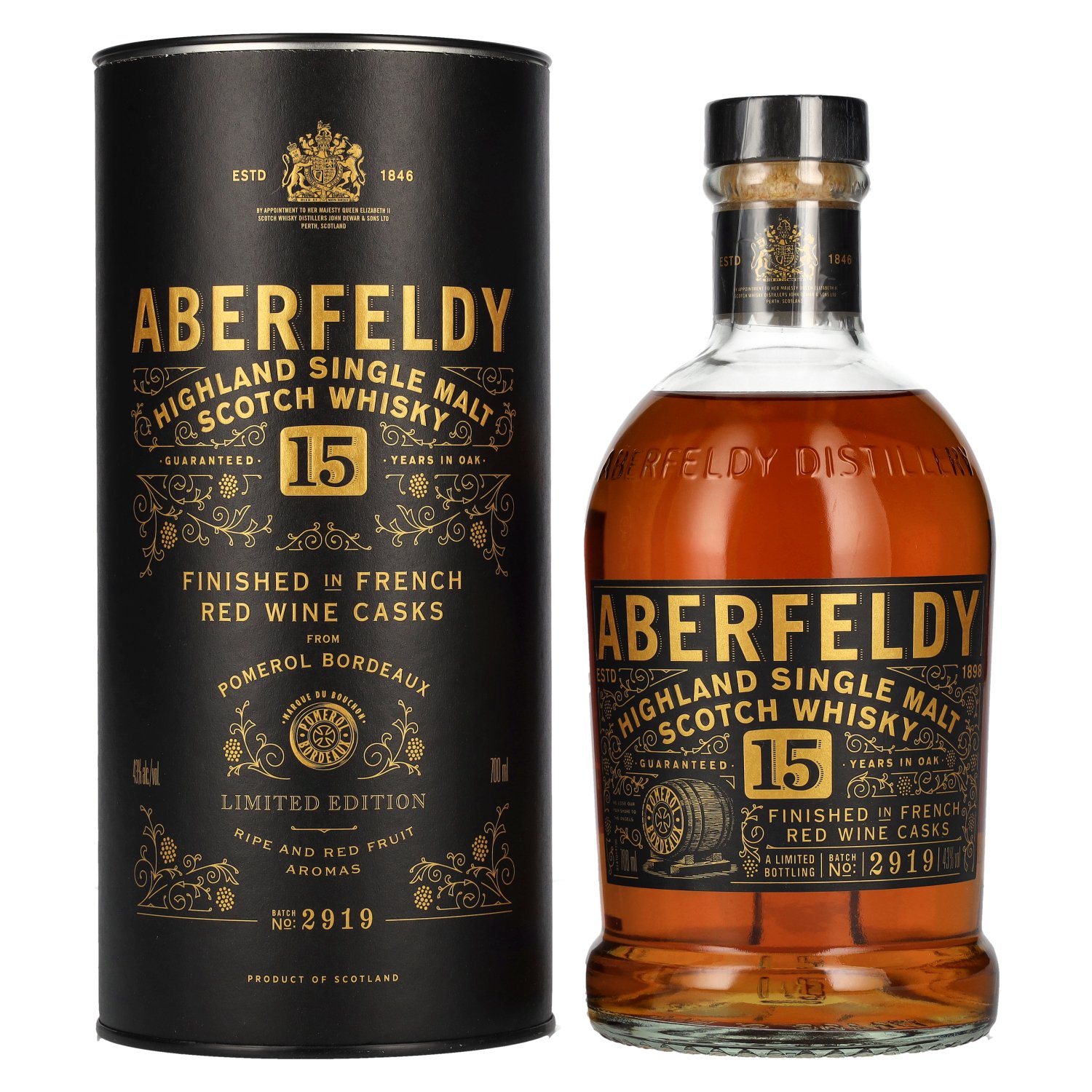 Die Brennerei Aberfeldy ist für ihre süßen und milden Whiskys bekannt. Der 15-Jährige reifte zunächst in wieder befüllten und wiederaufbereiteten Bourbonfässern und erhielt anschließend ein vier- bis fünfmonatiges Finish in französischen Rotweinfässern aus dem Pomerol. Durch das Finish im Pomerol-Fass kommen die intensiv fruchtigen Noten des Aberfeldy noch mehr zur Geltung.