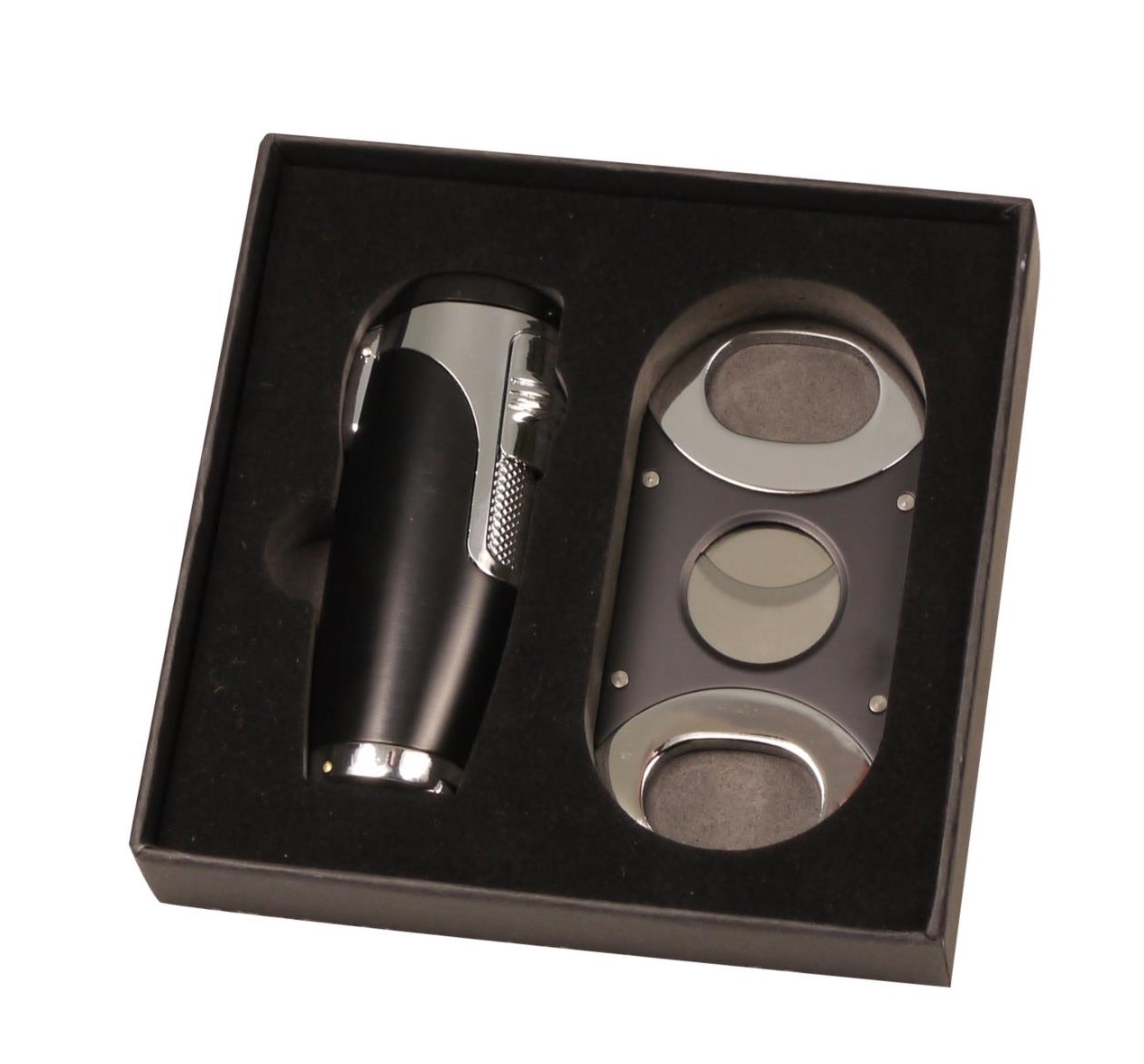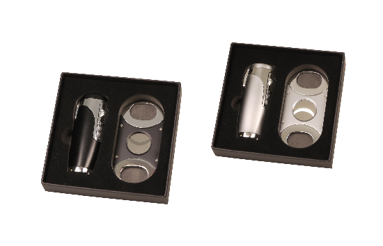 Dieses Set besteht aus zwei Accessoires für exklusiven Rauchgenuss: Ein verchromtes Feuerzeug mit Jet-Flamme und ein dazu passender Zigarrenschneider.