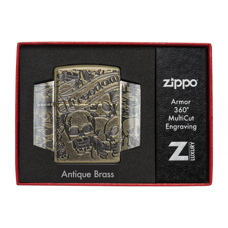Dieses Feuerzeug wurde durch eine 360°-Gravur erzeugt. Das Armor Case ermöglicht es, tiefere Linien in das Feuerzeug zu gravieren. Dadurch entstehen ungewöhnliche Muster auf dem Feuerzeug, die eine einzigartige Haptik erzeugen. Die einzelnen Facetten der Schädel sind in detaillierten Linien dargestellt.