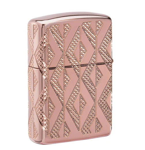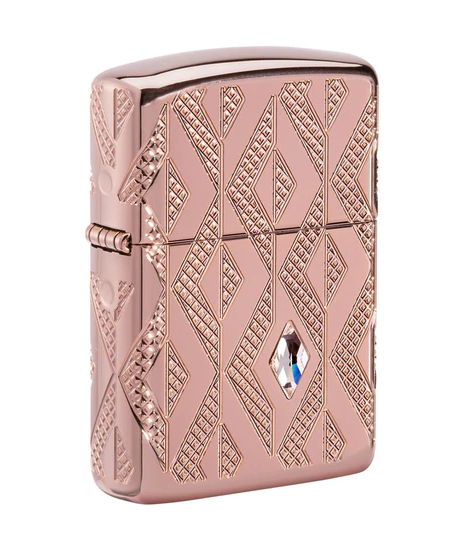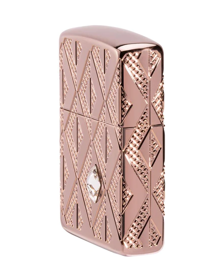 Wir stellen eine neue dickwandige Finish-Option vor, Armor ® Rose Gold. Im Schmuckdesign ist Roségold nach wie vor ein Trend und Kundenliebling. Jetzt bietet Zippo diesen beliebten Metallic-Farbton in der beliebten Armor ® -Gehäuselinie an, der Deep Carve, MultiCut und andere Luxusprozesse ermöglicht, die am besten für die dickeren Gehäusewände geeignet sind, wie in diesem Design zu sehen ist. Dieses Design zeichnet sich durch MultiCut-Diamantmuster aus, die das Armor ® Rose Gold-Gehäuse umhüllen, wobei ein diamantförmiger Kristall an der Vorderseite angebracht ist.