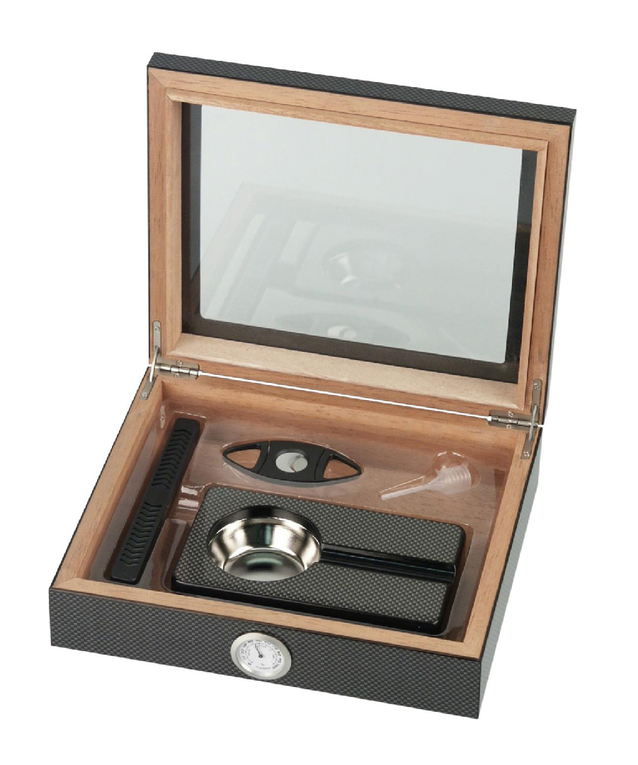 Dieses Set garantiert den perfekten Einstieg in die Welt des Genussrauchens. Der schlichte Humidor mit edlem Glasausschnitt im Deckel in edler Carbonoptik ist mit fast allem gefüllt was man zum Genuss von Zigarren benötigt. Der Zigarrenschneider sorgt für den nötigen Schnitt und der Aschenbecher ist nicht nur zum Auffangen von Asche und Zigarrenresten denn er hat noch dazu eine praktische Ablage.