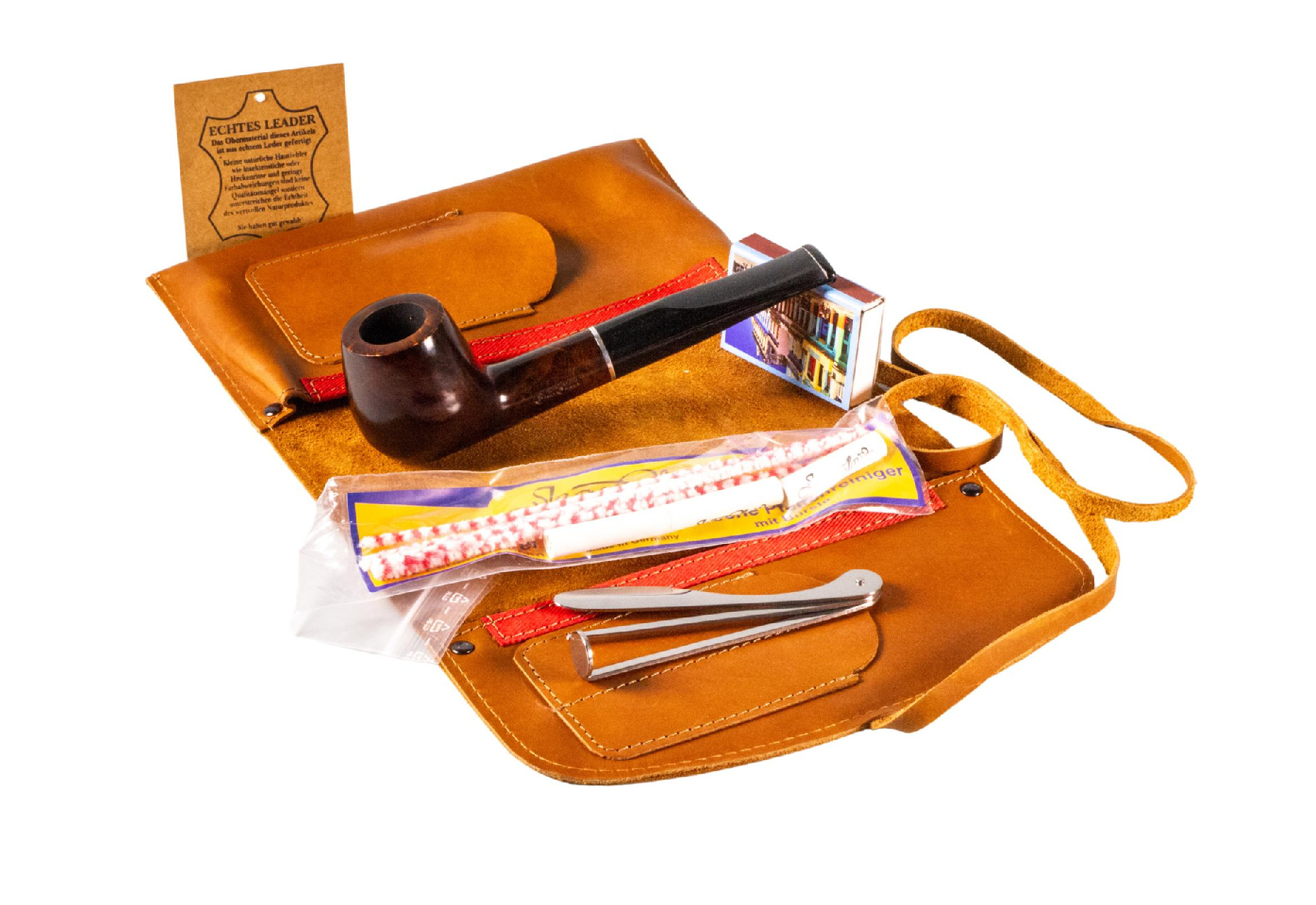 Inhalt: Pfeife mit Acrylmundstück, Pfeifenbesteck, Pfeifenreiniger, Aktivkohlefilter, Rollbeutel