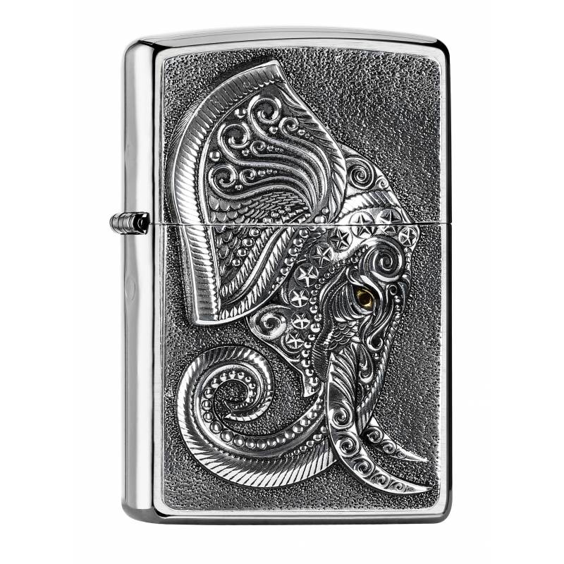 Ein aufwendiges Emblem mit einem Elefantenkopf auf einem Brushed Chrome Zippo.